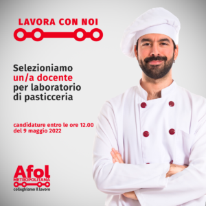 Afol Metropolitana rende noto che è che è indetta una selezione per titoli e colloquio per l’assunzione con contratto di lavoro subordinato a tempo indeterminato e tempo parziale misto all’87,5% dell’orario di lavoro contrattuale con articolazione oraria di 36 ore/settimana dal 01/09 al 15/07 e zero ore dal 16/07 al 31/08 di n. 1 Docente di laboratorio di pasticceria, categoria C1 – profilo professionale “Tecnico Servizi Formativi”, da assegnare ai Centri di Formazione Professionale dell’Agenzia Metropolitana per la Formazione, l’Orientamento e il Lavoro.