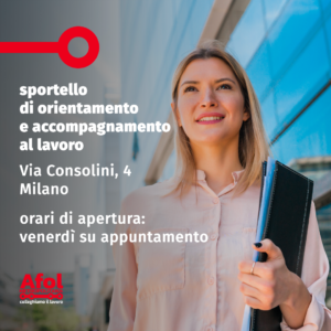 Lo sportello, in via Consolini 4 a Milano, riceve su appuntamento il venerdì mattina, dalle 9 alle 13. È possibile chiedere informazioni o prenotare scrivendo a cmd.milano@afolmet.it.