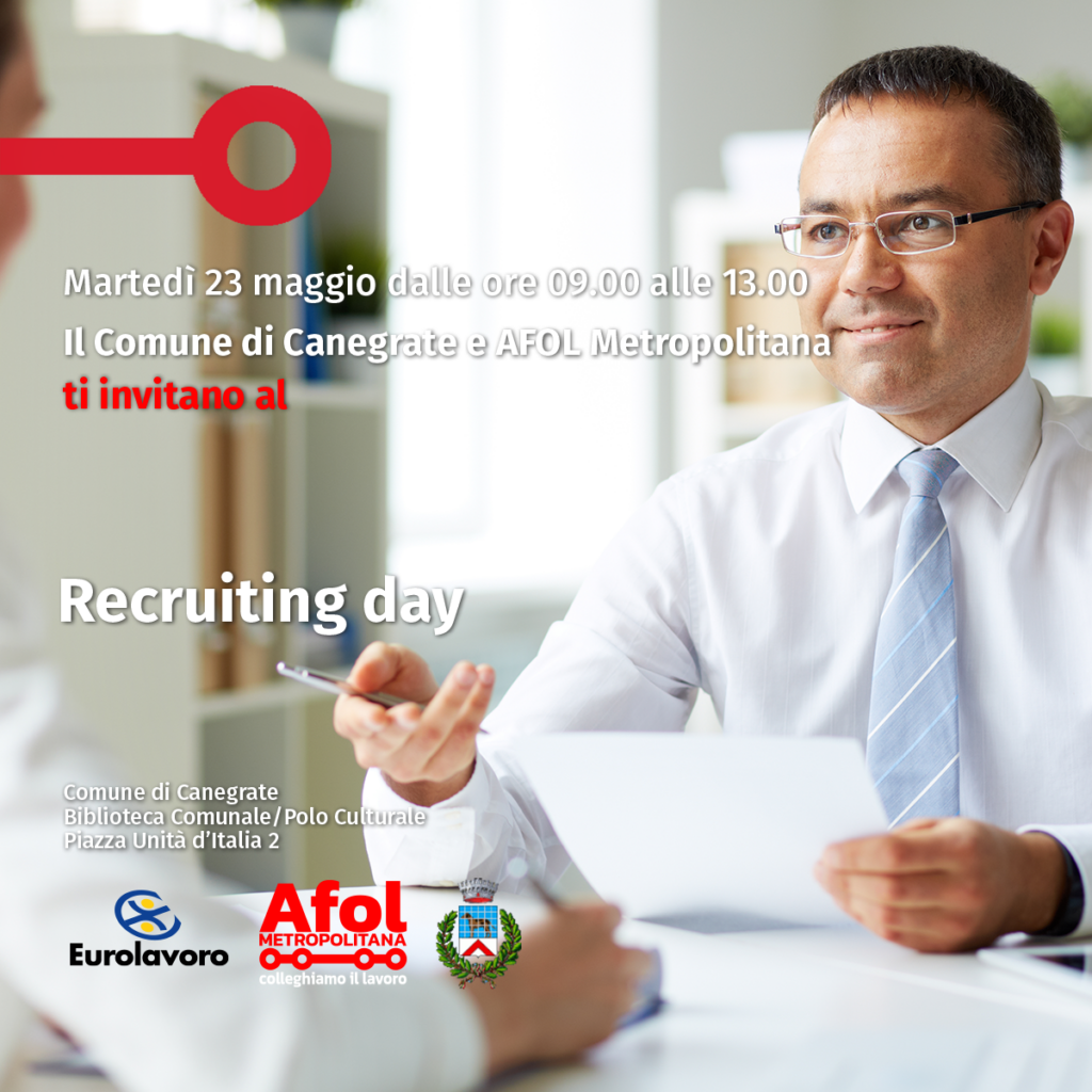 Nati con l’obiettivo di fare incontrare chi cerca lavoro con chi lo offre, in questo doppio appuntamento gli esperti di AFOL Metropolitana ti illustreranno i servizi territoriali pubblici attivi per la ricerca di un impiego e ti forniranno preziose indicazioni e consigli utili per proporti in maniera efficace alle imprese. I recruiting day ti offrono la possibilità di conoscere meglio i servizi offerti dai Centri per l’impiego, in modo particolare quello di Legnano e quello di Magenta e i suoi operatori saranno a tua disposizione per un’intera giornata per conoscerti e per descriverti le diverse opportunità di formazione e orientamento, quelle più adeguate alle tue esigenze e quelle offerte dal programma GOL (Garanzia Occupabilità Lavoratori). Troverai anche spazio per ricevere consigli su come rendere efficace la ricerca di lavoro e valorizzare le tue esperienze e i tuoi interessi personali. Durante gli appuntamenti saranno infine illustrate le opportunità offerte dalla Legge 68/99 per favorire l’occupazione delle persone con disabilità.