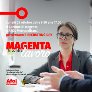 Persone in cerca di occupazione, esperti di servizi al lavoro e imprese si danno appuntamento lunedì 23 ottobre dalle 9.30 alle 17.00 al Recruiting day Magenta Incontra Lavoro, l’iniziativa organizzata da Afol Metropolitana in stretta collaborazione con il Comune di Magenta, la rete delle agenzie per il lavoro e gli enti di formazione del territorio.