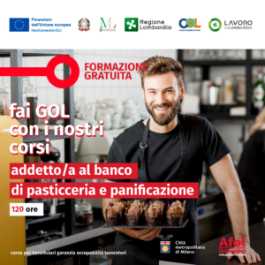 Parte il 3 ottobre il corso gratuito di Addetto al banco di pasticceria e panificazione, di 120 ore. Si svolge in presenza presso la sede di Sesto San Giovanni in viale Italia 548 ed è pensato per chi vuole lavorare nel campo della pasticceria o panetteria o desidera aprire una propria attività. Grazie al corso, imparerai le tecniche di preparazione dei prodotti base di pasticceria, panificazione e pizzeria come i metodi di impasto, farcitura e cottura. Spazio anche a un approfondimento sulla figura professionale del banconiere e dei suoi compiti all’interno di un’attività commerciale, dal confezionamento al rifornimento del banco alimentare, nel rispetto delle norme alimentari e di igiene e sicurezza. Il percorso prevede l’acquisizione di conoscenze afferenti alle diverse tipologie di ingredienti con particolare approfondimento delle abilità relative all’attività di preparazione nei diversi aspetti: tecniche e metodi di base, fasi di trasformazione e bilanciamento, farcitura, cottura e assemblaggio.