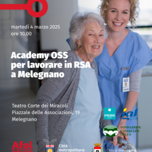 Partecipa all’evento di presentazione del corso Academy OSS presso il Teatro Corte dei Miracoli a Melegnano di martedì 4 marzo 2025 alle ore 10.00. L’evento è organizzato d AFOL Metropolitana, in collaborazione con il Comune di Melegnano, Fondazione Castellini, IAL Lombardia e Synergie Care.