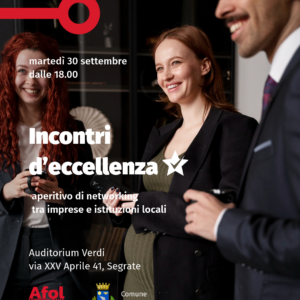 AFOL Metropolitana e il Comune di Segrate ti invitano a “Incontri di Eccellenza”, un aperitivo di networking B2B in programma martedì 30 settembre 2025, a partire dalle ore 18.00 presso l’Auditorium Verdi, in via XXV Aprile 41 a Segrate.