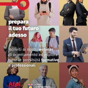 Rivolto alle persone con più di 30 anni, il webinar ti informa sui principali programmi di politica attiva del lavoro ti illustra Il servizio di incontro domanda/offerta di lavoro di Afol Metropolitana e ti fornisce fotografie e trend dell’attuale mercato del lavoro post emergenza Covid. Avrai la possibilità di fare un bilancio delle tue capacità e dei tuoi punti di forza, definire i tuoi obiettivi professionali e il tuo personal branding.