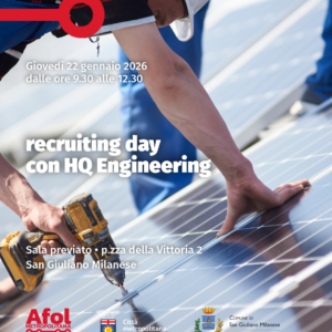 Nell’ambito delle nuove professioni legate a sostenibilità e ambiente, Afol Metropolitana in collaborazione con il Comune di San Giuliano Milanese ti aspetta per un recruiting day con HQ Engineering Italia.