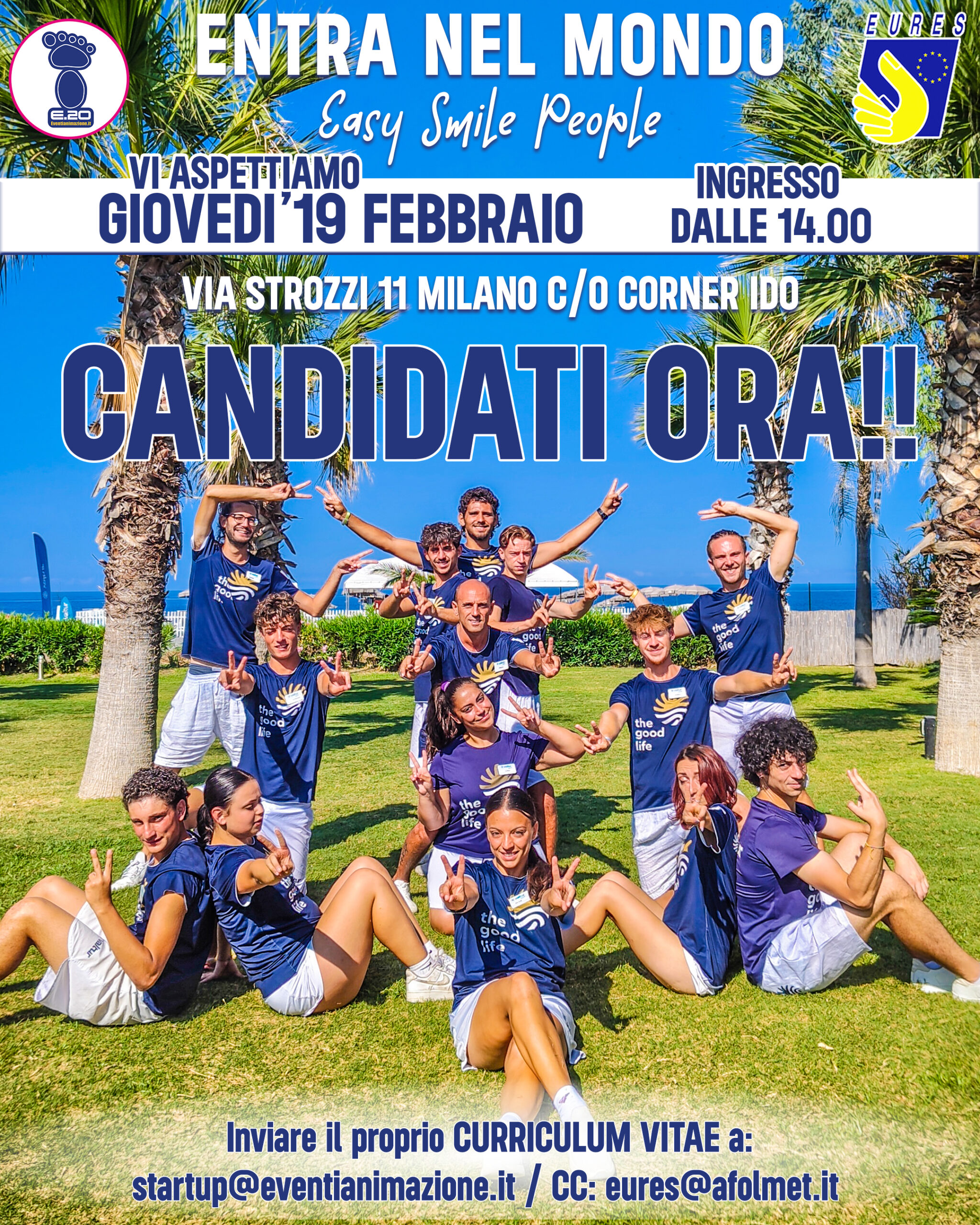 Tornano i Recruiting Day dedicati al mondo dell’animazione e del turismo, organizzati in collaborazione con EURES Milano, la rete di servizi per la mobilità professionale in Europa. Due appuntamenti pensati per chi desidera lavorare in villaggi e strutture turistiche, in Italia e all’estero.
